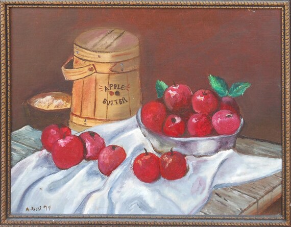 Vintage Oil Paint Of Apples In Bowl With Bucket Of Apple Butter Signed